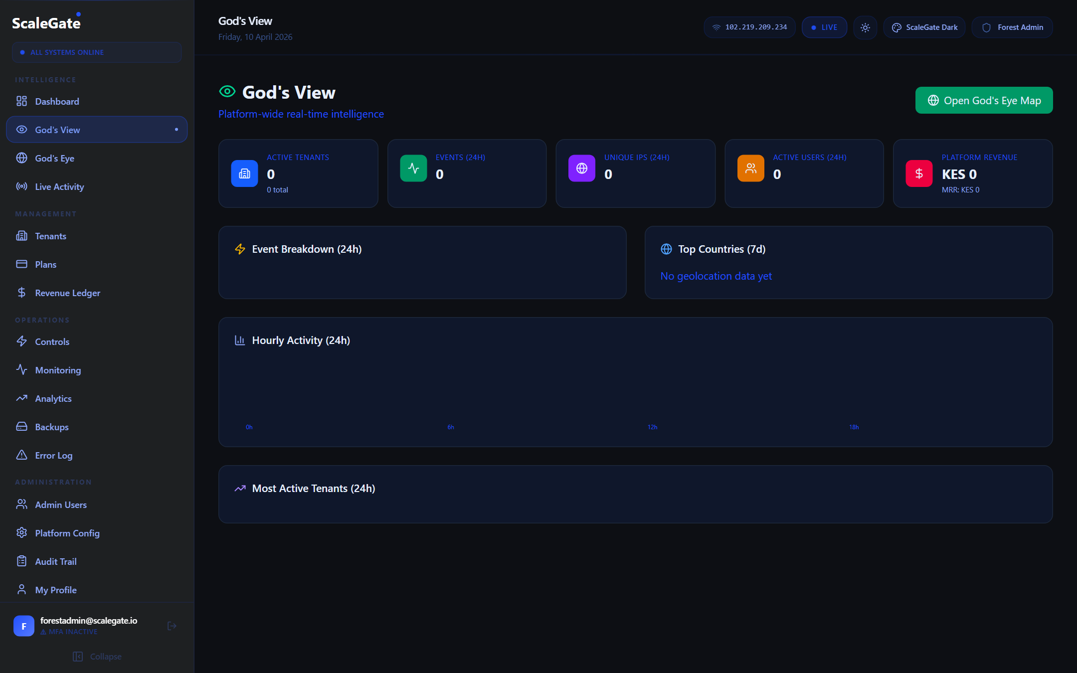 The Dashboard is your "first room" after logging in. The dark left sidebar is now visible on every page from here on — it's how you navigate everything. From top to bottom you'll see: Dashboard, God's View, God's Eye, Live Activity, Tenants, Plans, Revenue Ledger, Controls, Monitoring, Analytics, Backups, Error Log, Admin Users, Platform Config, Audit Trail, My Profile.