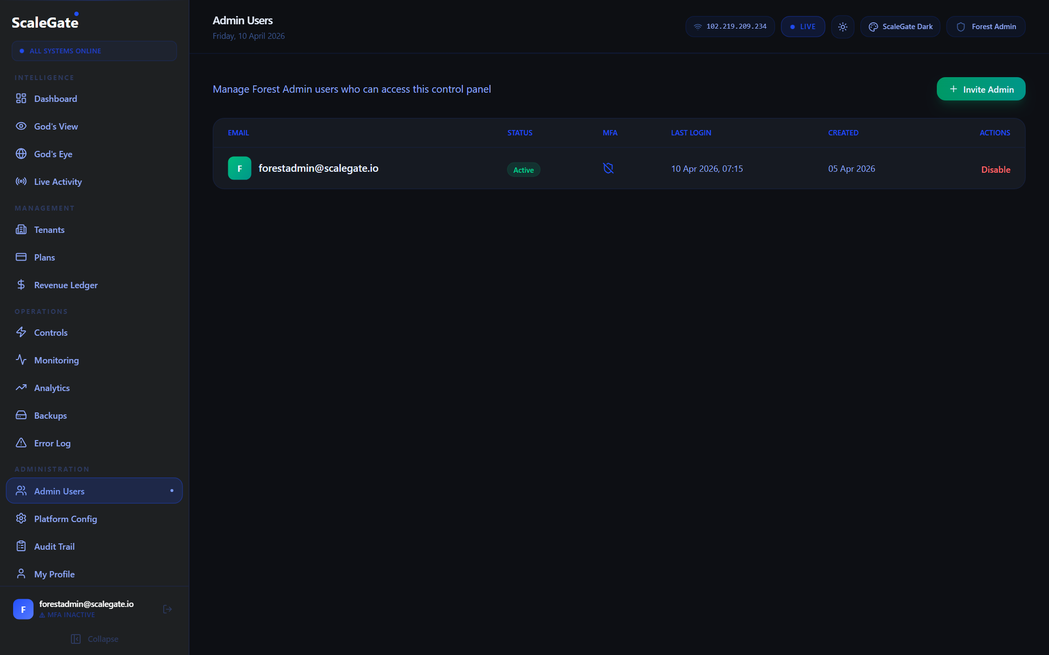 The table lists every Forest Admin with columns: Email (with avatar), Status (Active / Disabled badge), MFA (on/off icon), Last Login, Created, Actions. In this screenshot you can see forestadmin@scalegate.io: marked Active, no MFA enabled, last login 10 Apr 2026 07:15, created 05 Apr 2026, with a red Disable action link.